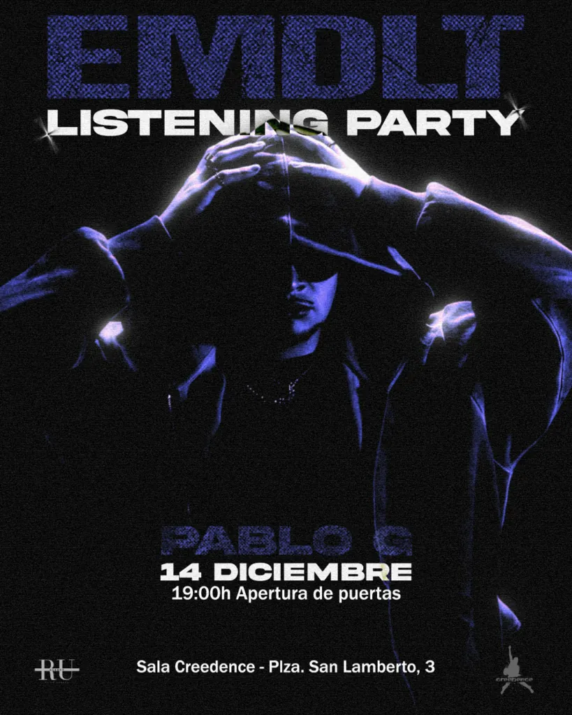 En Medio De La Tormenta (EMDLT) es el nuevo EP de Pablo G, artista emergente de Zaragoza, que se presentará en una listening party el 14 de diciembre antes de su lanzamiento oficial el día 19. Con influencias de trap, R&B, plugg y sonidos melódicos, el proyecto muestra el lado más profundo y emocional del artista. A través de letras introspectivas, refleja el desamor, la confusión y la soledad en medio del caos. La sesión ofrecerá una experiencia íntima y sensorial, donde el público podrá adentrarse en el universo sonoro y visual del EP.