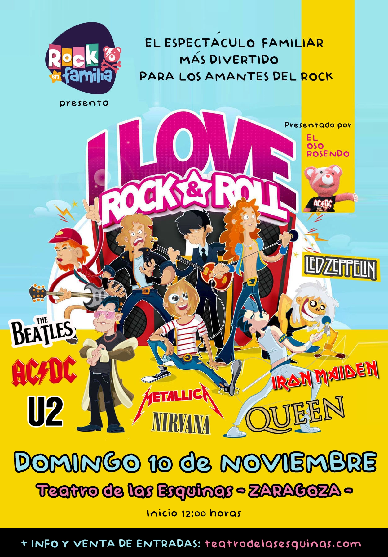 Tras el éxito de los dos últimos años del espectáculo familiar ‘I LOVE ROCK AND ROLL’, con más de 100.000 espectadores y una extensa GIRA NACIONAL que lo ha llevado con continuos SOLD OUTS por los PRINCIPALES TEATROS de más de 15 ciudades, Rock en familia aterriza de nuevo en el Teatro de las Esquinas para ofrecernos un espectáculo lleno de música y humor en el que los más pequeños de la casa disfrutarán descubriendo la historia y las canciones más representativas de AC/DC, Queen, Ramones, Metallica, The Beatles, Iron Maiden, Led Zeppelin ¡y mucho más!