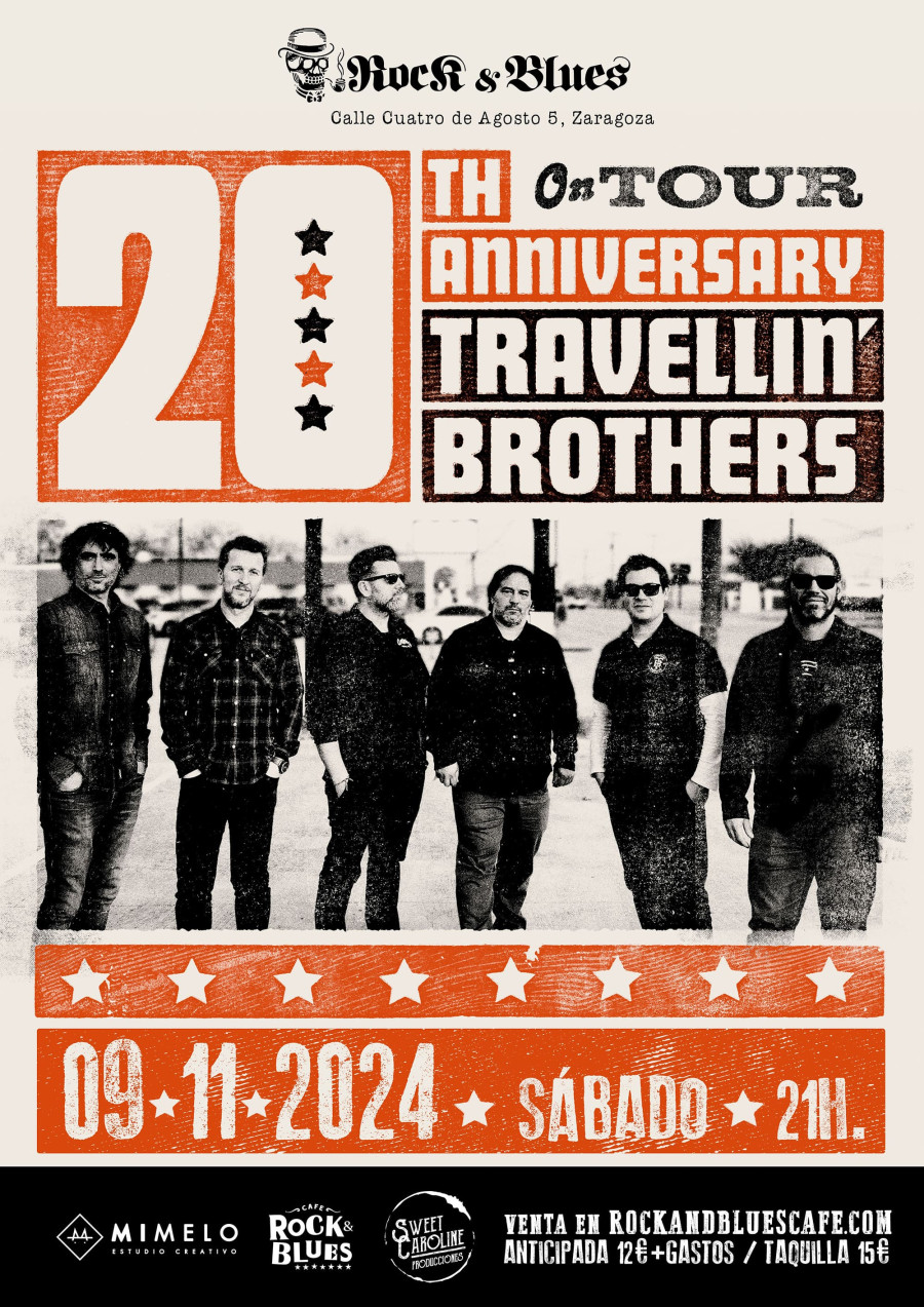 Ganadores del European Blues Challenge 2015 en Bruselas (mejor banda europea), 20 años, diez discos y más de 1.200 conciertos contemplan a los Travellin’ Brothers, como una de las bandas más respetadas de la escena Blues Europea. Tras sus giras por más de 15 países, incluyendo su visita a China por primera vez, este año celebran su 20º aniversario con una gira muy especial.