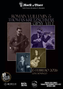 La única manera de viajar en el tiempo hacia Europa central de los años 30 es a través de la música y la música tenia dos nombres… Django Reinhardt y Stephane Grappelli. Ese sonido invocan artistas francéses Romain Vuillemin con su compañero de batalla Thomas Kretzschmar, acompañado por lo mejor de nuestra casa, Victor Paradis en la guitarra rítmica e Ivan Kovacevic en el contrabajo. Una noche en la emblemática sala. Una noche difícil de olvidar. Romain Vuillemin, guitarrista autodidacta especializado en guitarra manouche y swing jazz, desarrolló un estilo muy Django desde finales de los años 30 con su 4tet con el que grabó 3 discos. Este jazz "a la francesa" le lleva a actuar como acompañante o solista en numerosas salas y festivales de Europa y América del Norte, incluido el Festival de Jazz de Montreal, el festival Django in June en Estados Unidos, Konserthuset de Estocolmo y la Filarmónica de París. También es uno de los tres solistas del nuevo proyecto que está de moda: Génération Django, donde a la orquesta gitana se une un excepcional cuarteto de cuerda clásica. Thomas kretzschmar :violin Romain Vuillemin : guitara Victor Paradis: guitara Ivan kovacevic : contrabajo